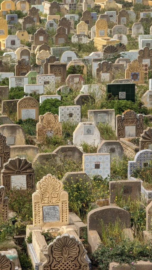 Pero antes de acceder al barrio moderno, pasamos sin intención ninguna por el cementerio de Salé, y aquello fue impresionante. Antes de todo avisar que las mujeres tienen semi prohibida la entrada al cementerio, dado que si no serían maldecidas por el profeta de turno que empezó esta tradición por llamarlo de alguna manera. Y esa falta de las mujeres en el mantenimiento de las tumbas y las atenciones a sus seres queridos decesos, déjenme decir que se nota claramente.