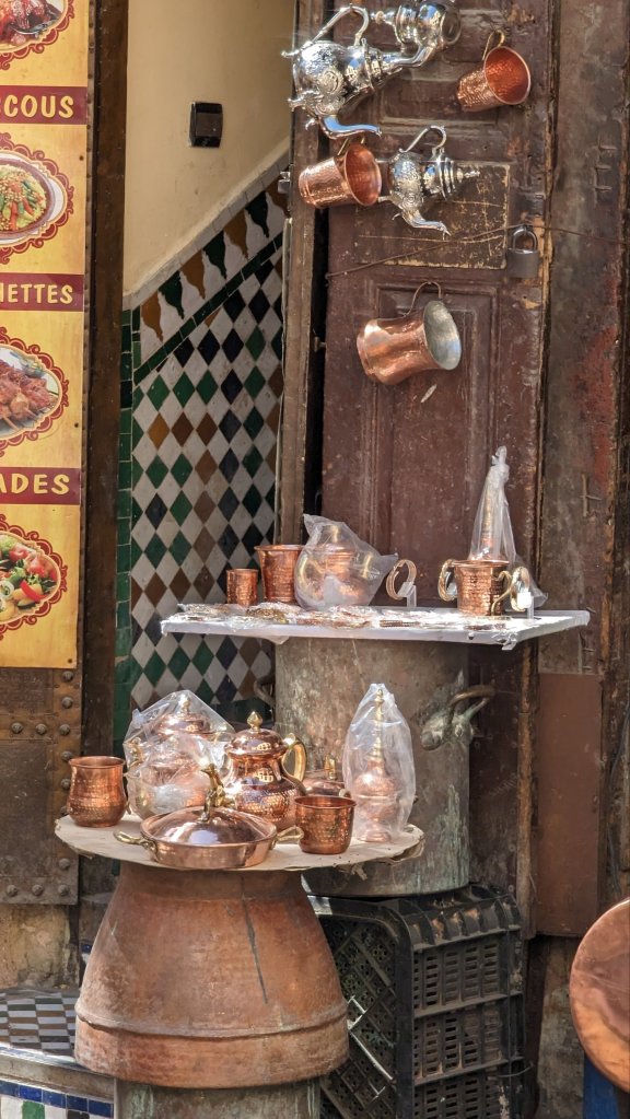 En la plaza Seffarine uno encuentra hombres ejerciendo labores antiguas todavía hoy usadas para crear objetos cotidianos, como vasijas de barro, sartenes de metal, ollas artesanales, tahines…