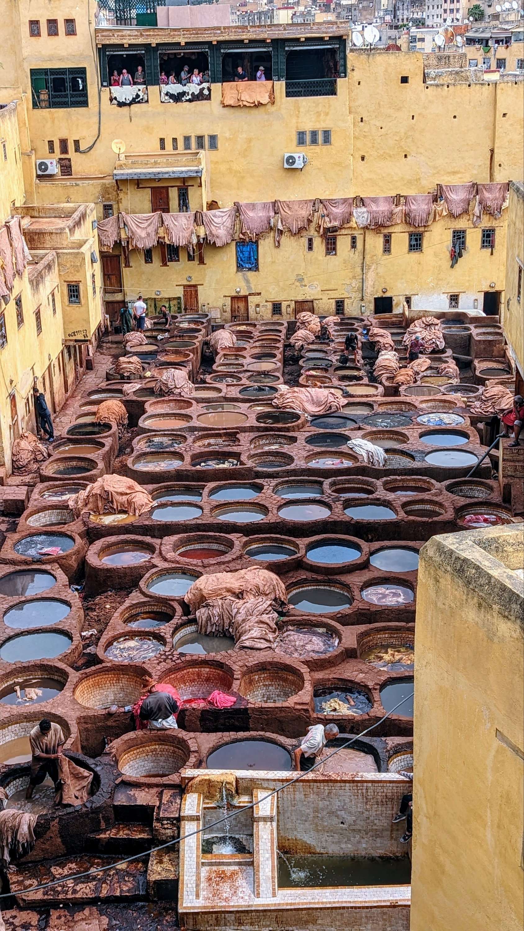 Ver trabajar a esos hombres en esas condiciones es algo que todo primermundista debería hacer alguna vez en la vida. Imaginarse en la piel de esos trabajadores que se meten hasta casi el pecho en unas tinas elevadas sobre el terrenos para tratar, limpiar y tintar las pieles. Sin ninguna protección y con su piel como única barrera… Con restos orgánicos microscópicos en proceso de putrefacción, flotando en el mismo líquido en el que tú cuerpo se sumerge. Oigan, cómo cambia la perspectiva de la vida con estas visiones…