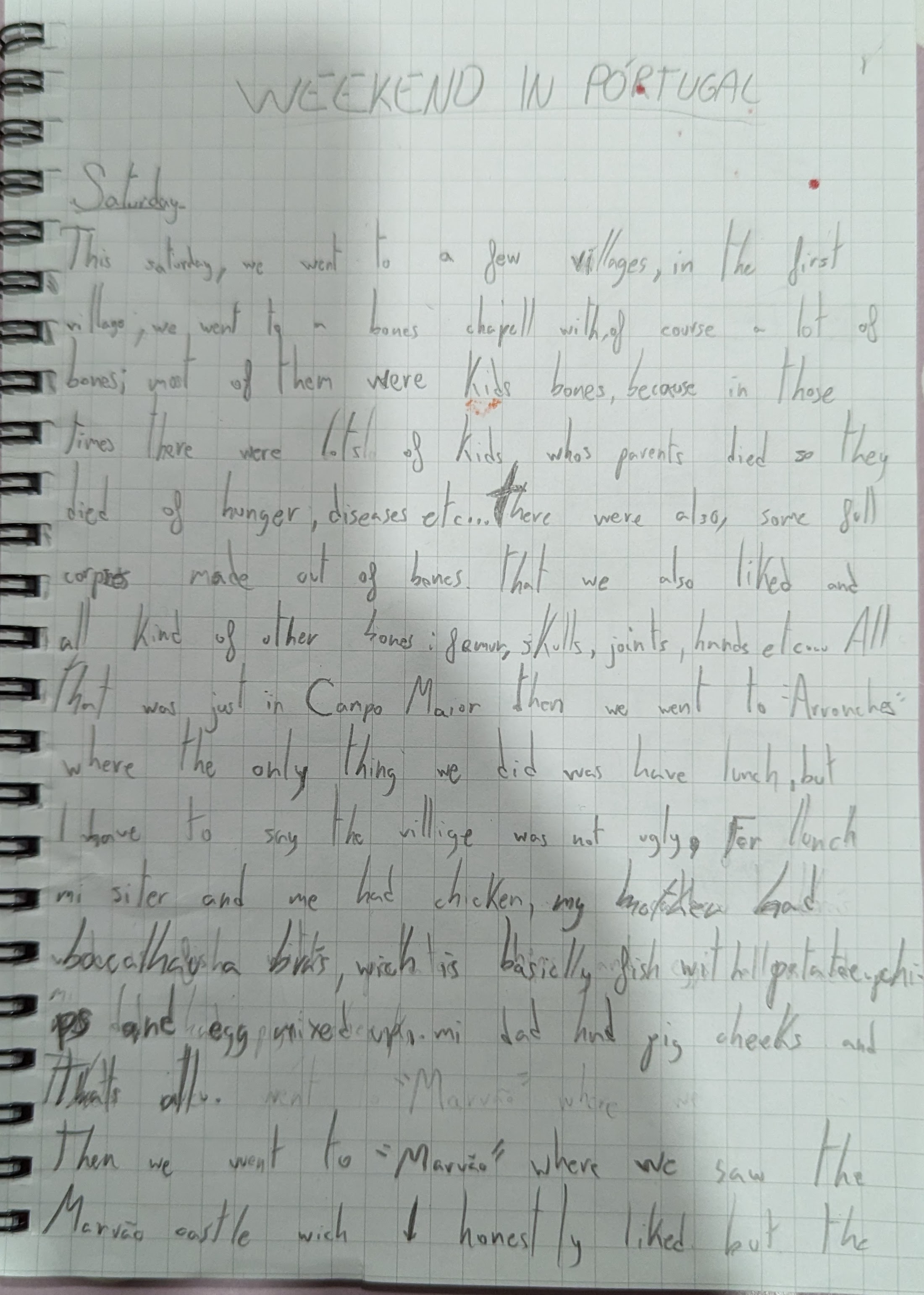 For lunch mi* sister and me had chicken my mother had bacalhau a bras which is basically fish (cod) with potato chips and egg mixed up. Mi* dad had pigs cheeks (bochecha) and That’s all.