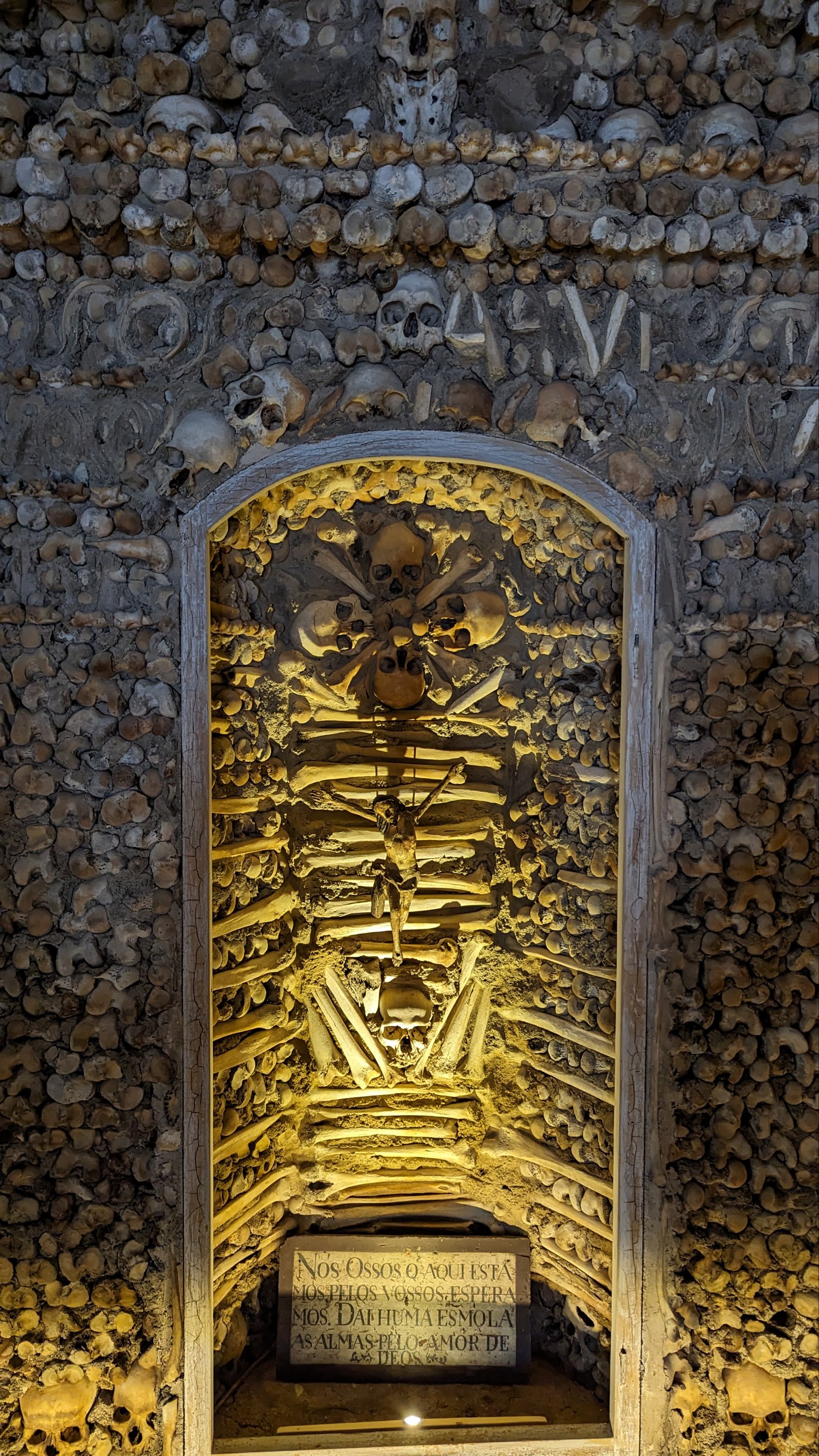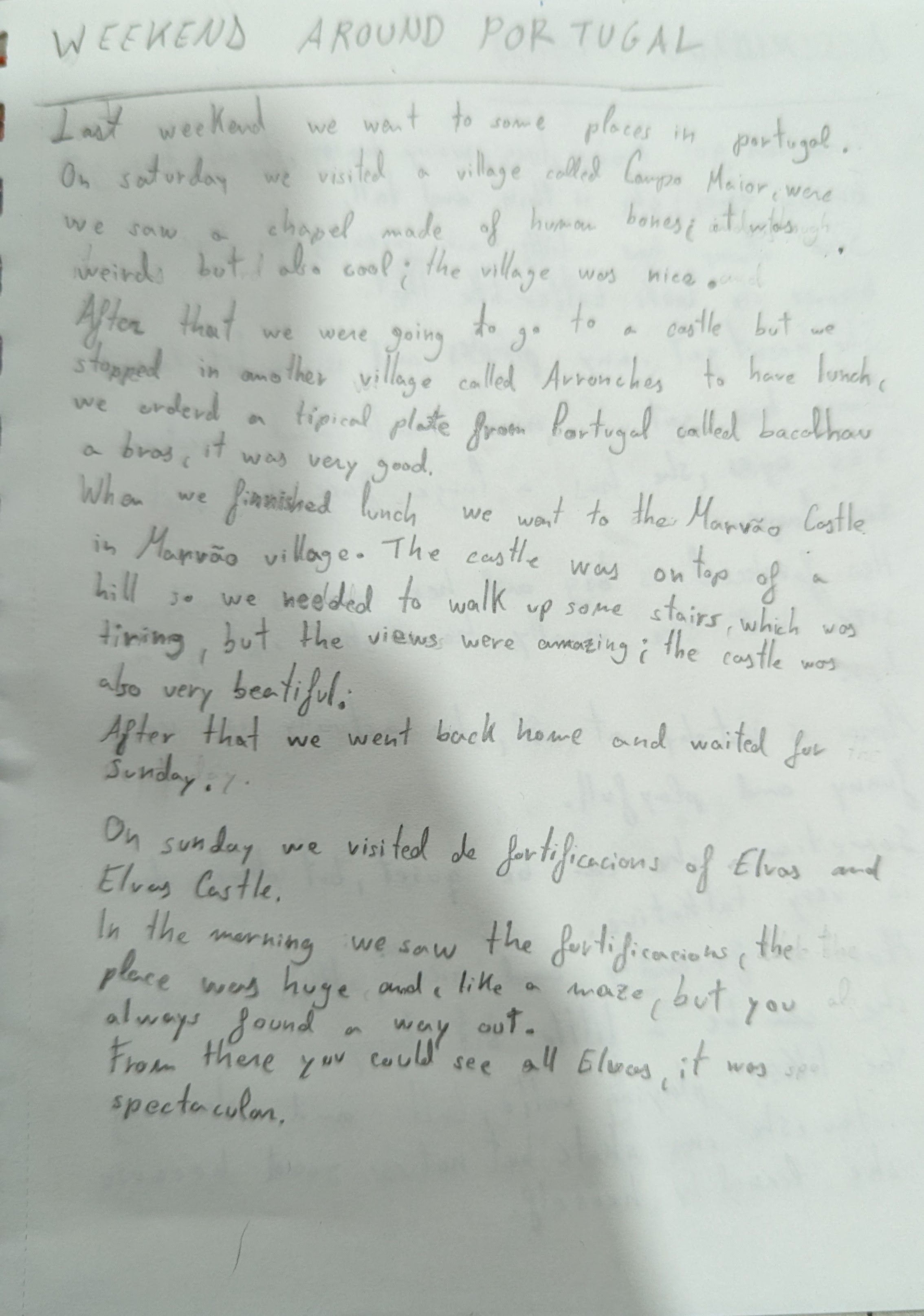 Last weekend we went to some places in Portugal. On Saturday we visited a village called Campos Maior, where we saw a chapel made of human bones, it was weird but also cool; the village was nice.