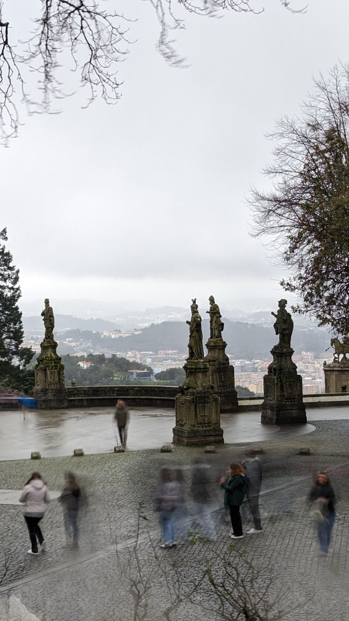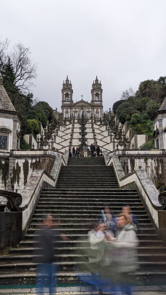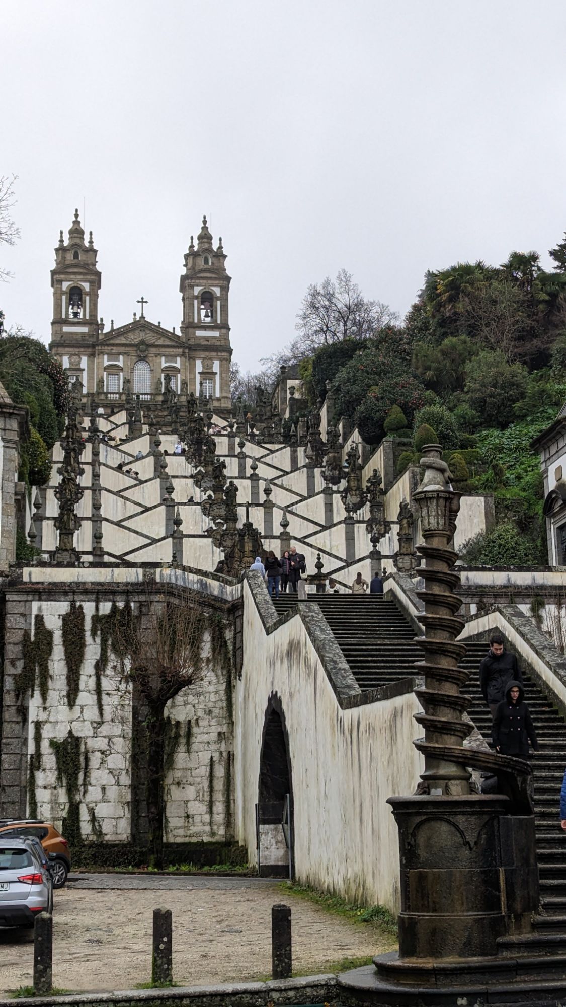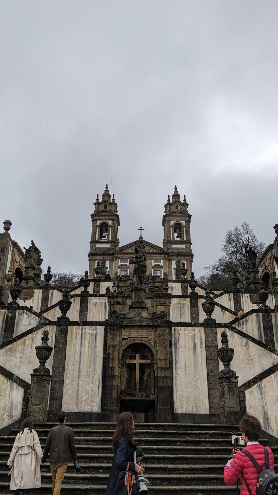 El Santuario de Bom Jesus do Monte es famoso por su escalinata barroca, decorada con una serie de capillas que representan la Pasión de Cristo, y estatuas de figuras bíblicas. Las estatuas en el semicírculo antes de la entrada son parte de esta narrativa visual.
