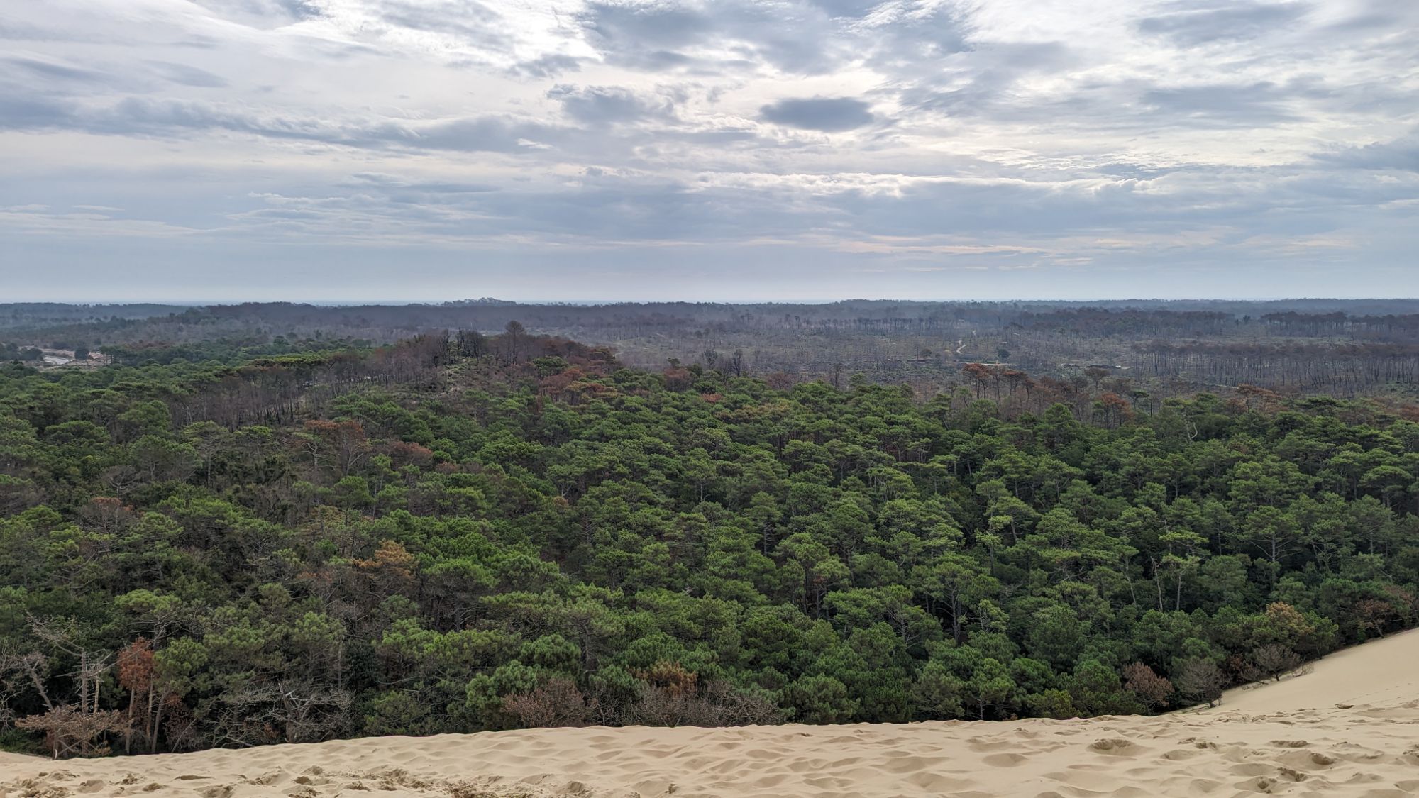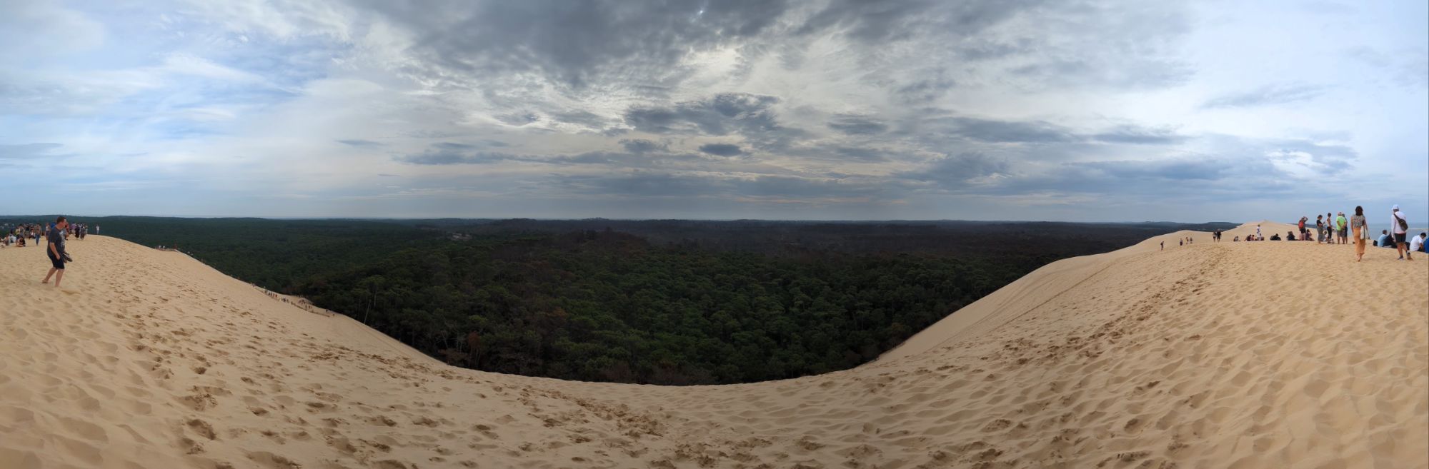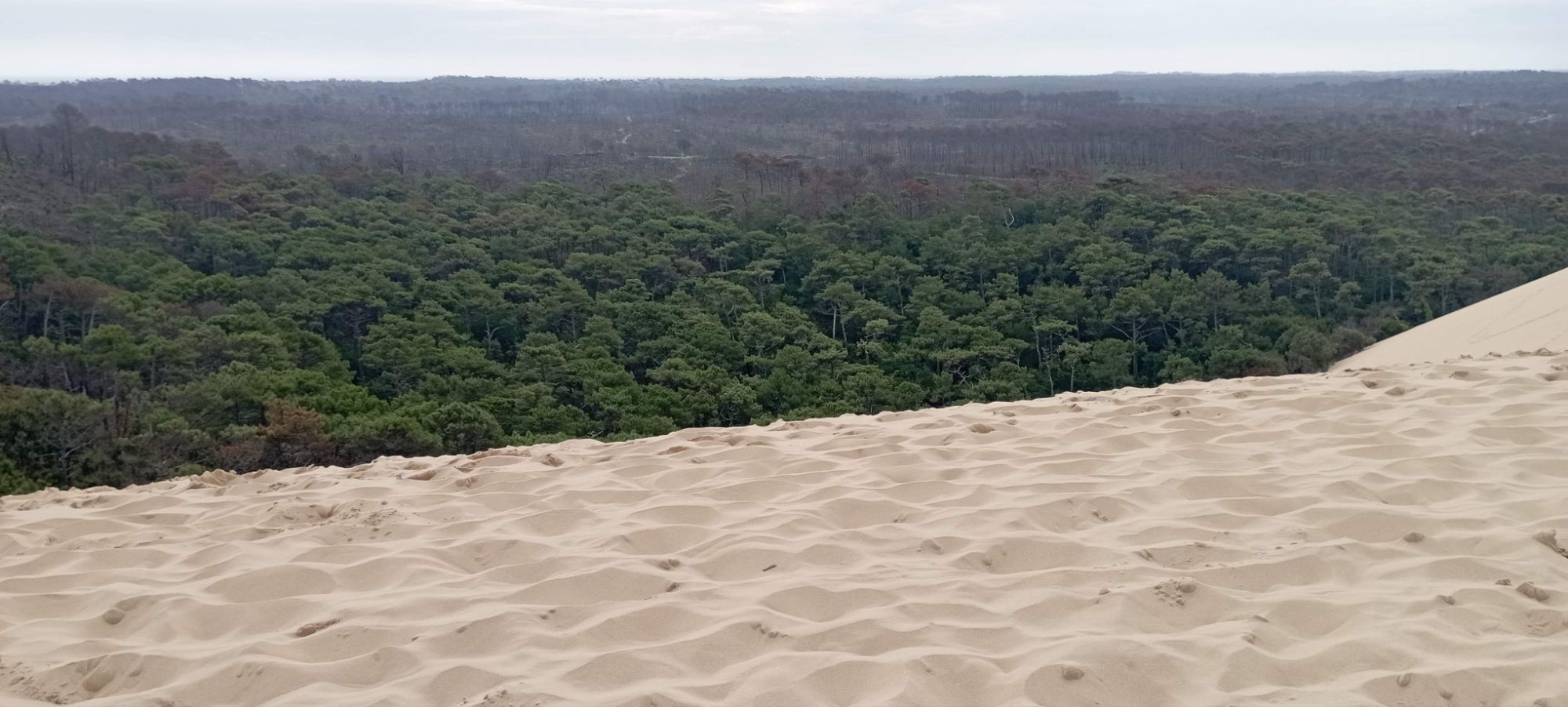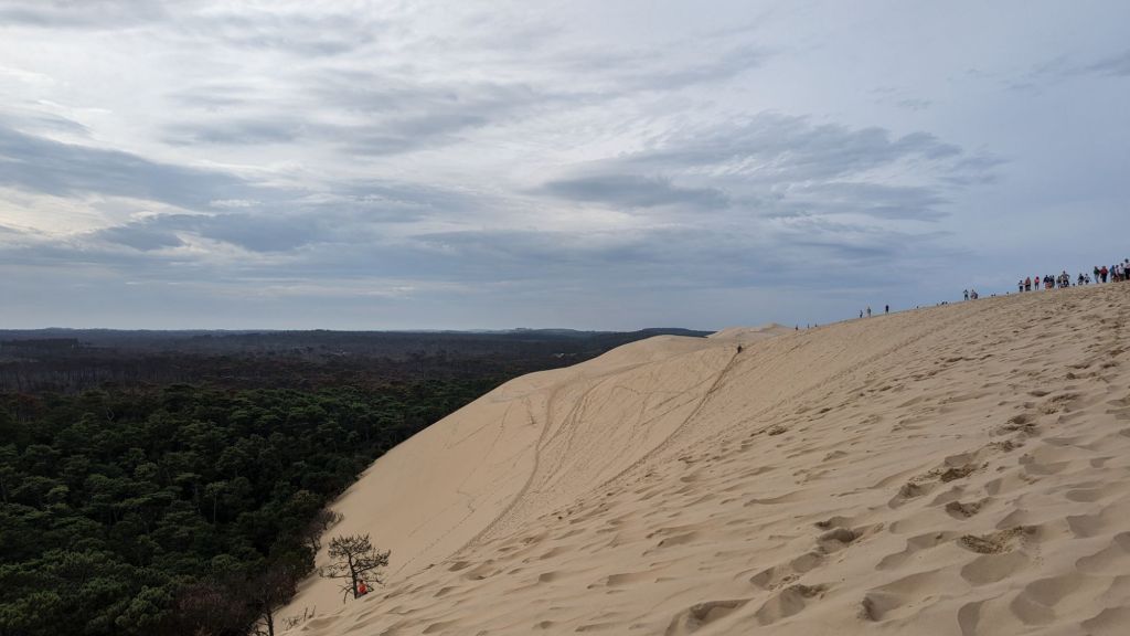 A un lado el océano, al otro, otra clase de marea, la de miles de árboles que se extienden formando un horizonte ondulado que llega más allá de donde la vista alcanza… Uno de siente extremadamente pequeño en lo alto de esta maravilla. Sobre todo habiendo experimentado estar en la base de la duna, junto a los altos árboles del bosque, y saber el tamaño de dichos árboles. Para luego subir y subir y mirarlos desde muy arriba, tan pequeños que cuesta ver sus límites, siendo consciente de la altura real de los mismos. Es realmente impresionante.