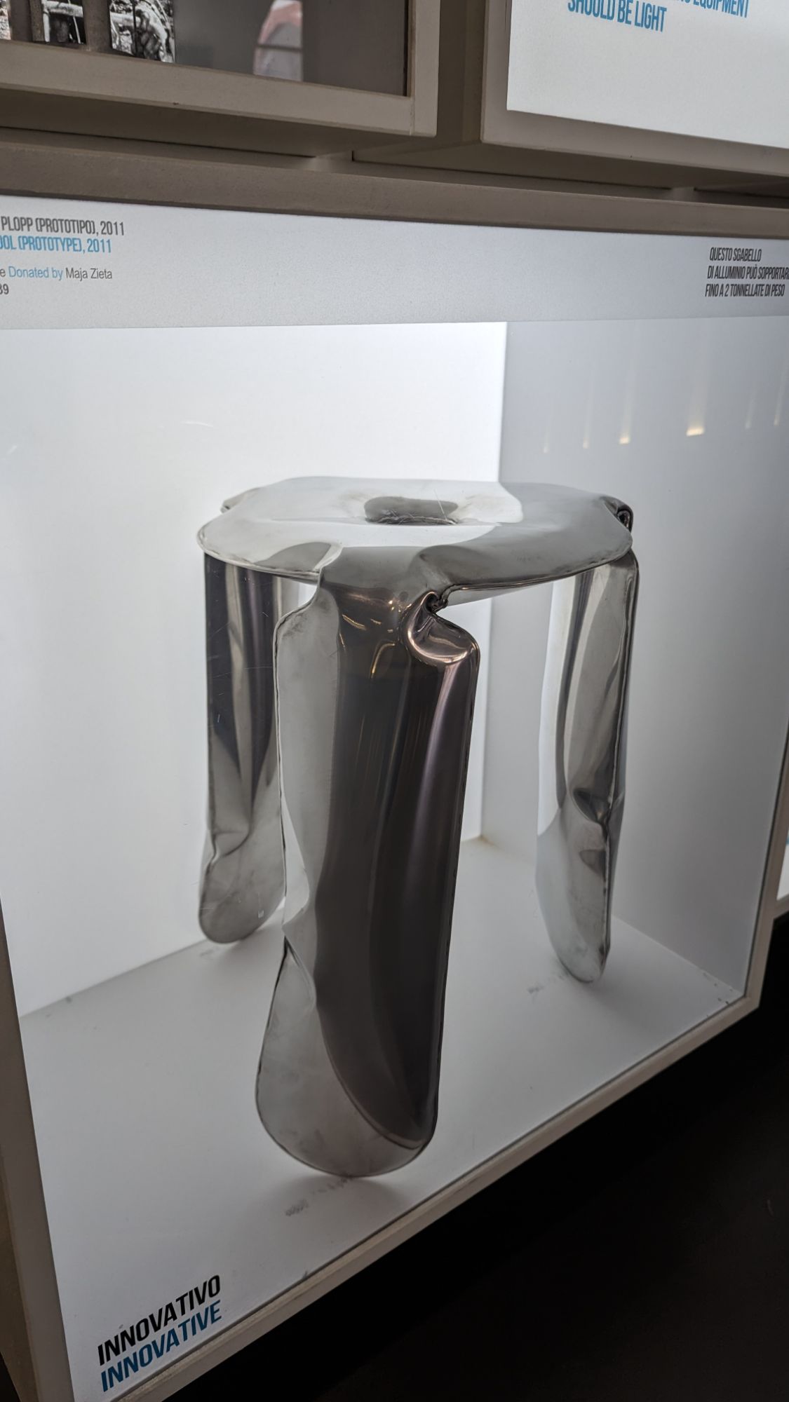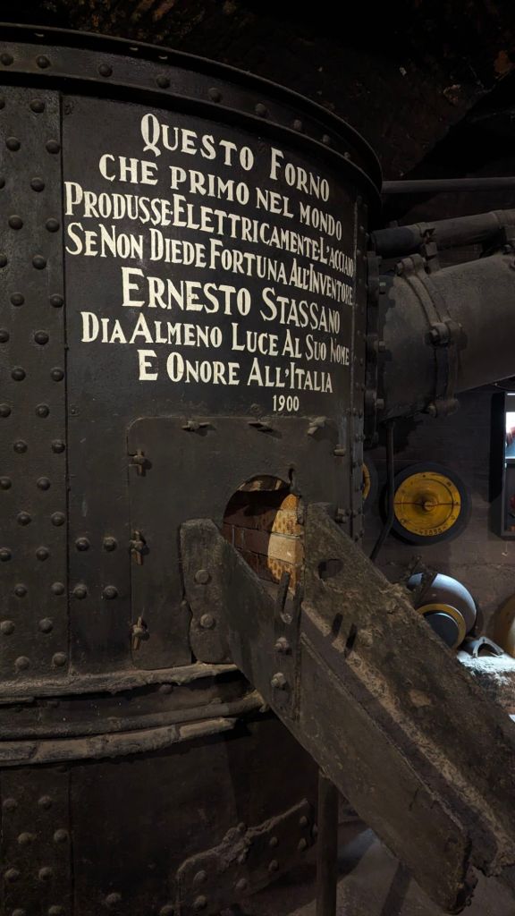 – ¿Quieres ver un objeto extraño que no se encuentra en ningún otro lugar de Europa? El horno Stassano es el primer horno eléctrico de arco indirecto para producir acero en la historia. Gracias a los tres electrodos colocados en la parte superior, transforma energía eléctrica en energía térmica. El calor generado permite obtener acero de alta calidad a partir de chatarra ferrosa en lugar de tener que usar mineral de hierro; con grandes ventajas económicas, medio ambientales, y sociales. Inventado en 1898, ganó el premio hito en el desarrollo de la metalurgia en 1992.