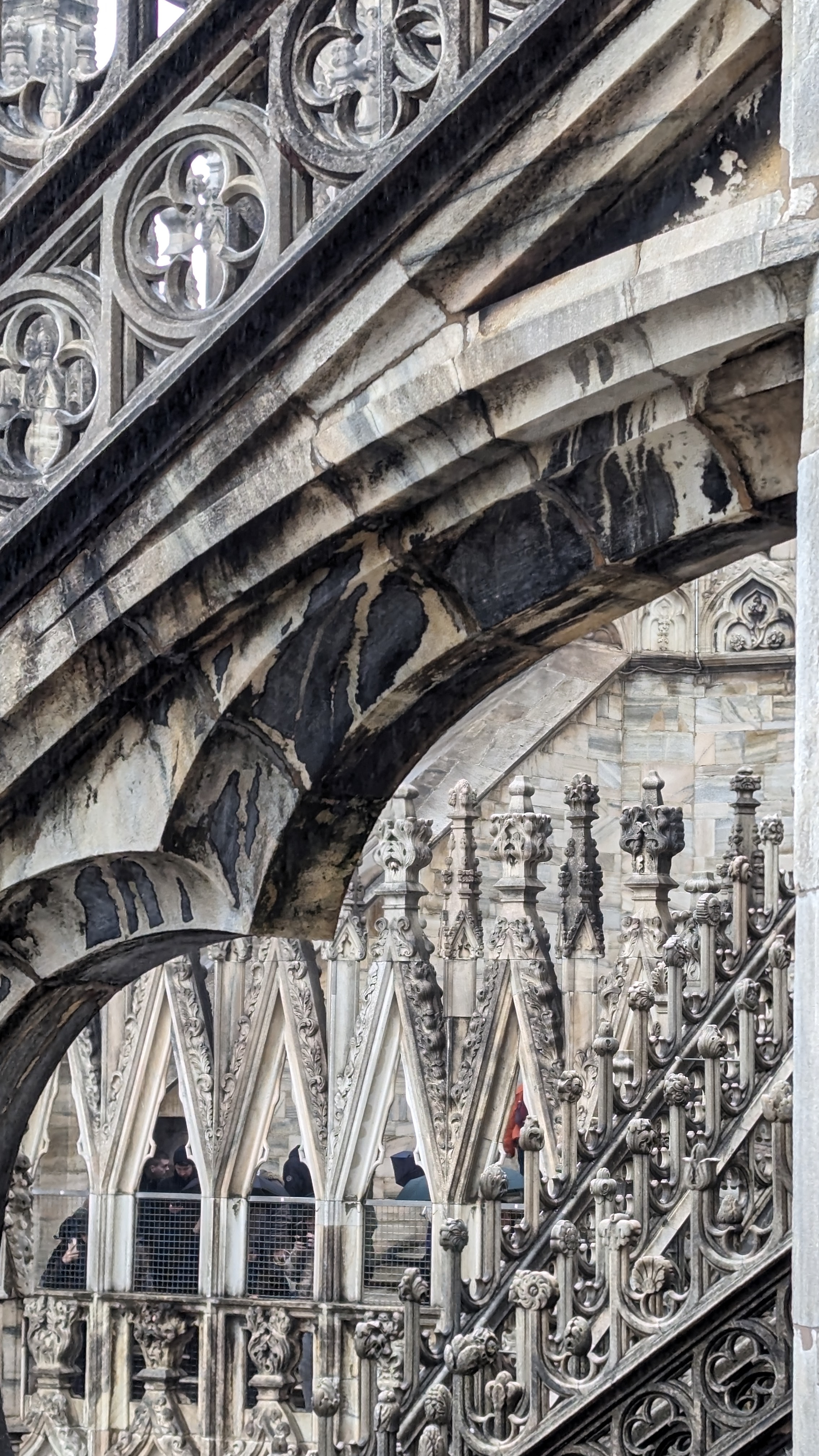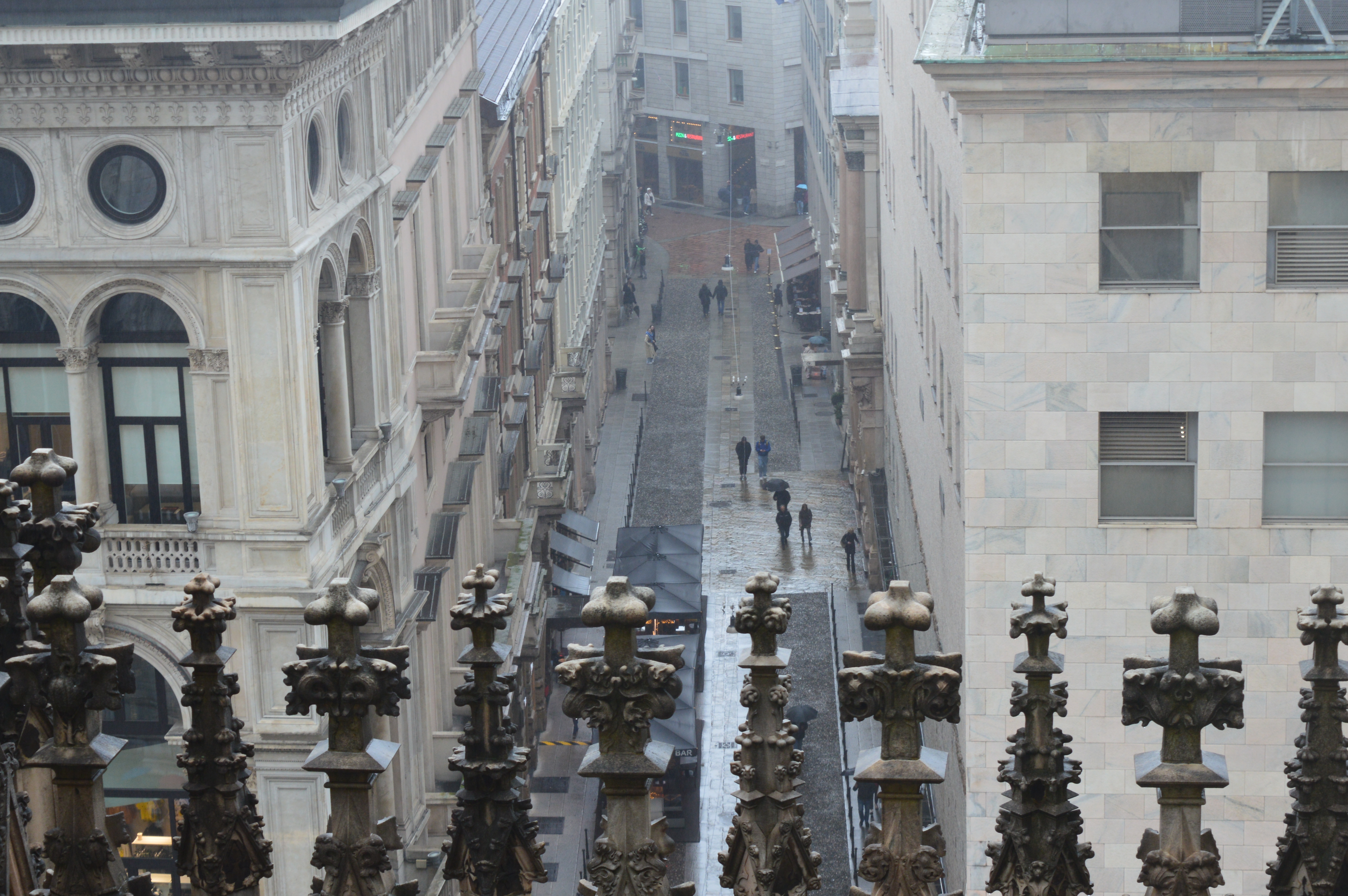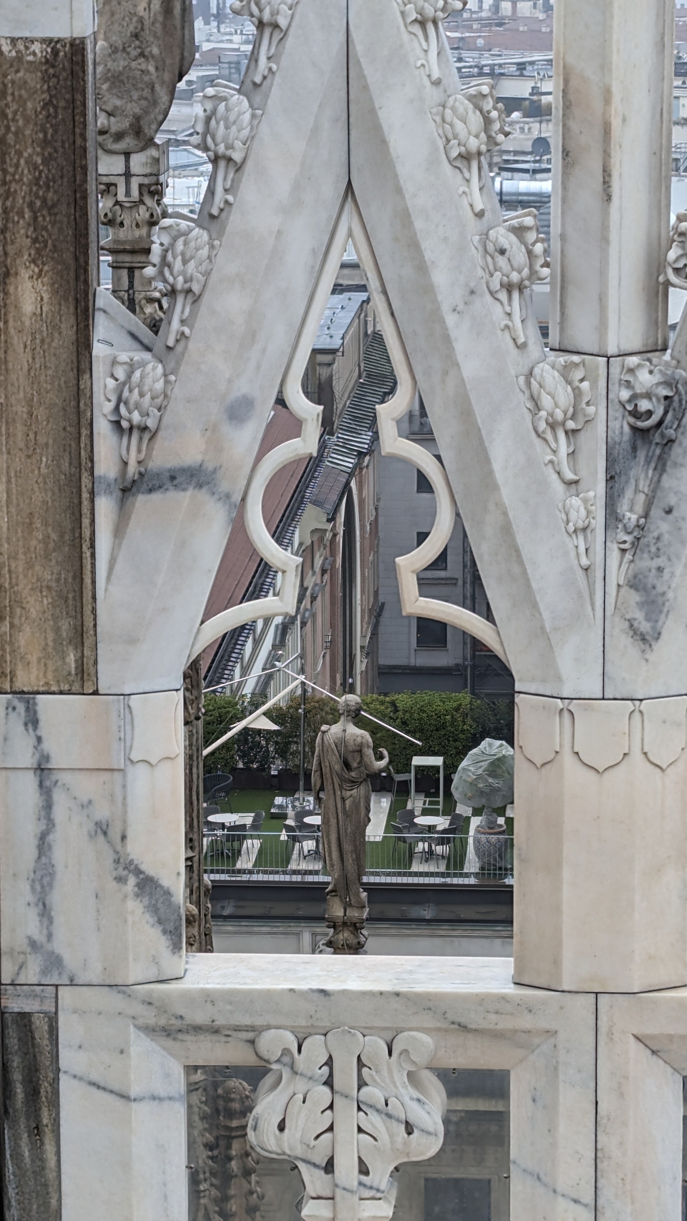 Subir a sus terrazas o techo es, donde la vista de Milán se despliega ante ti, un privilegio que quizás te puedas permitir. Ofreciendo un momento de conexión profunda, no solo con la ciudad, sino con la esencia misma del trabajo en pos de la belleza, viendo la ciudad desplegada ante tu vista, y las miles de majestuosas estatuas a corta distancia. Una experiencia imperdible desde donde se pueden obtener vistas panorámicas de Milán y de cerca a los detalles arquitectónicos de las torres y estatuas. El acceso a la terraza se puede hacer por escaleras o por un ascensor. Preparen buen calzado, porque el tejado de esta catedral es como andar un pueblo entero pero a unos cincuenta metros de altura.