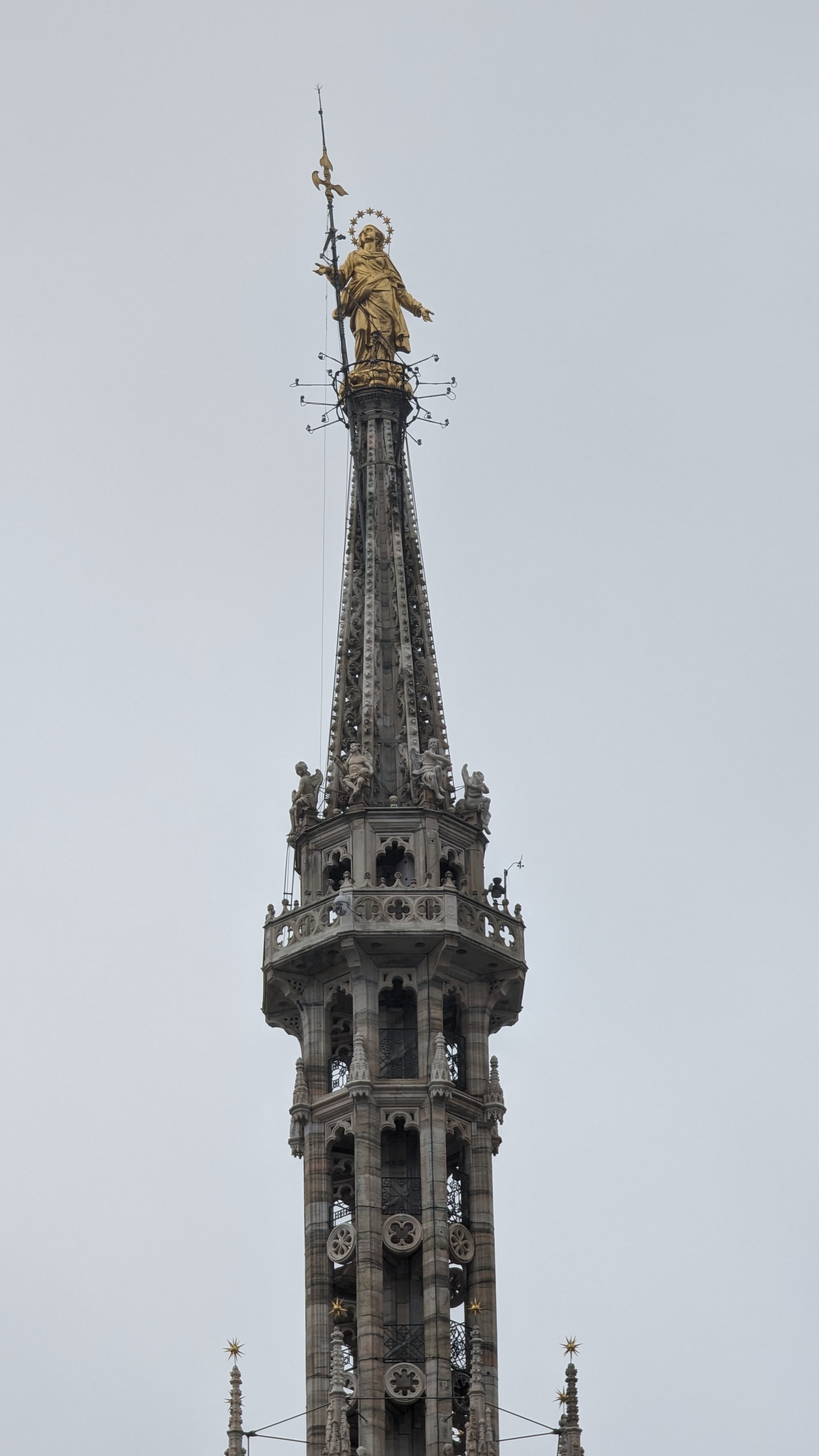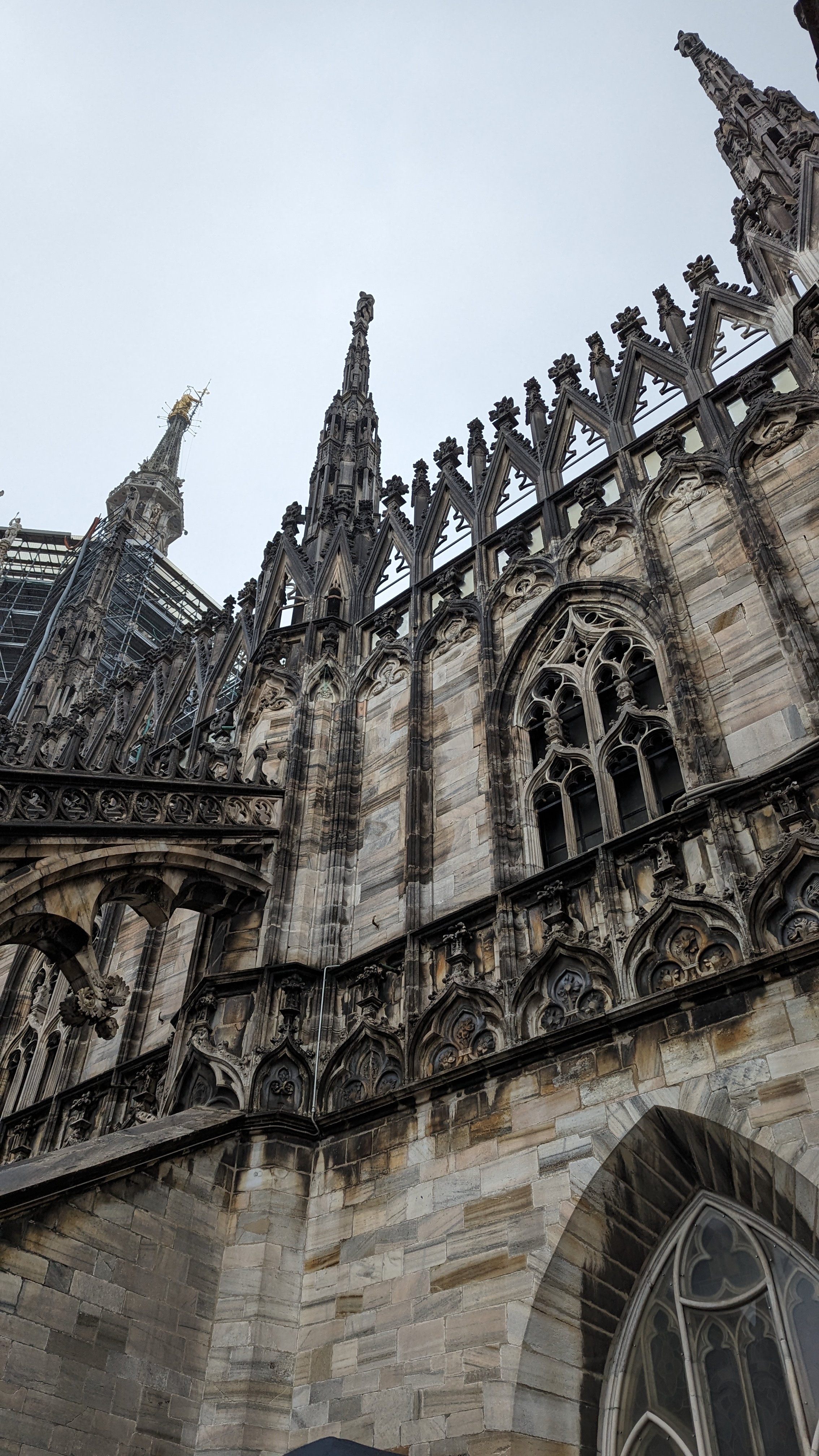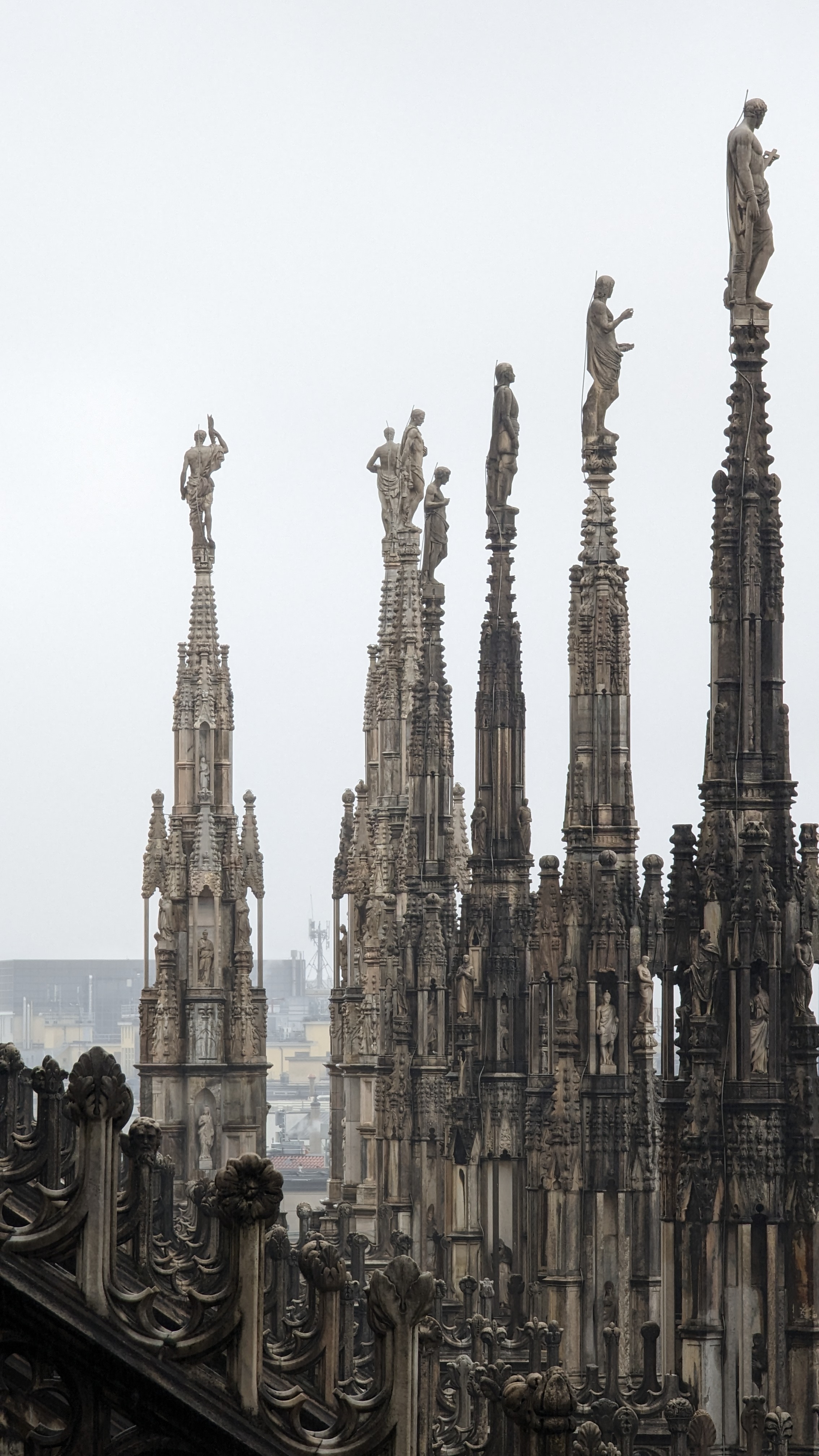 Las más de 3,400 estatuas que adornan el Duomo parecen contar historias de pasión y devoción, mientras que la Madonnina, brillando dorada en lo alto, vigila la ciudad y la protege.