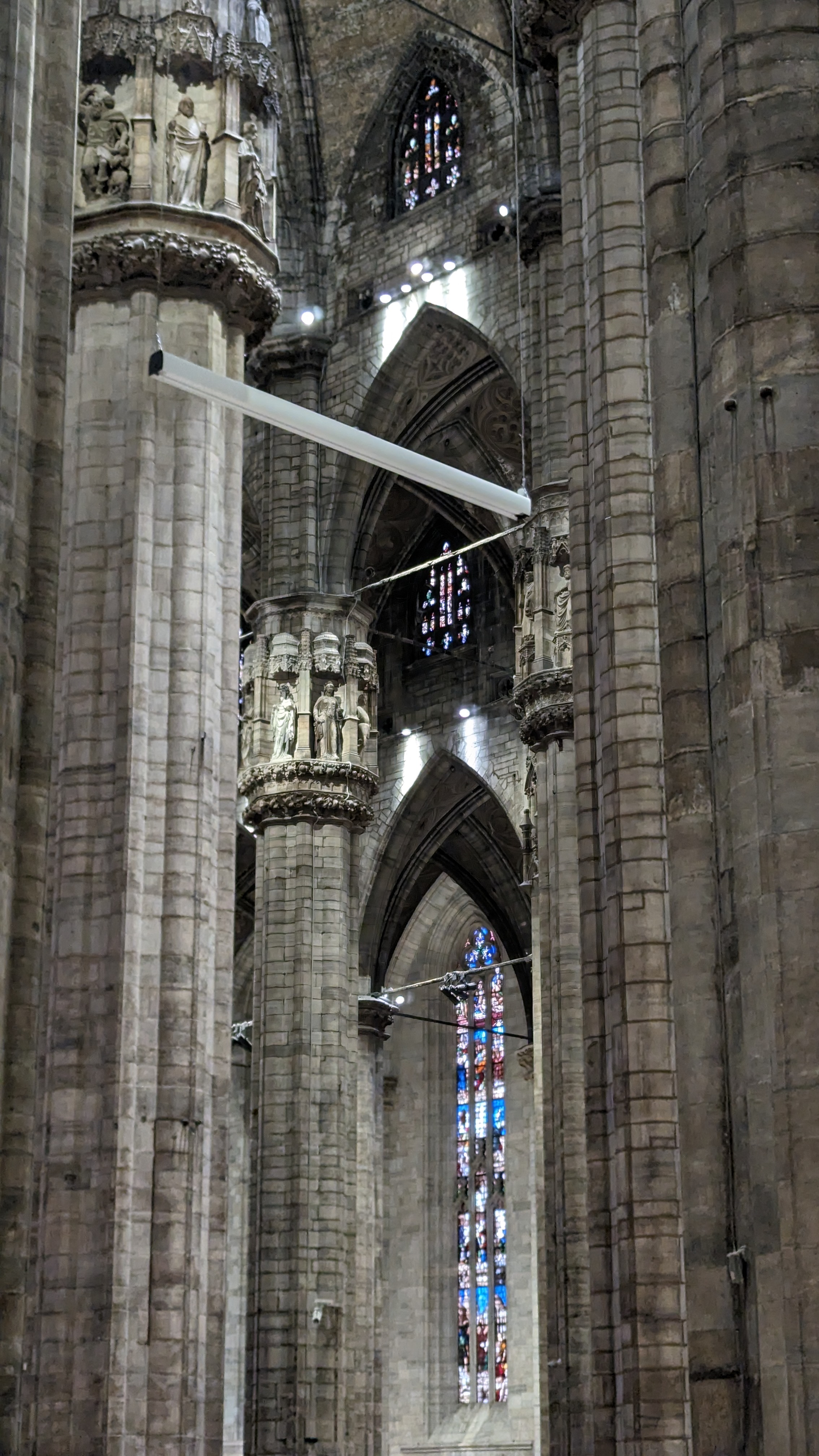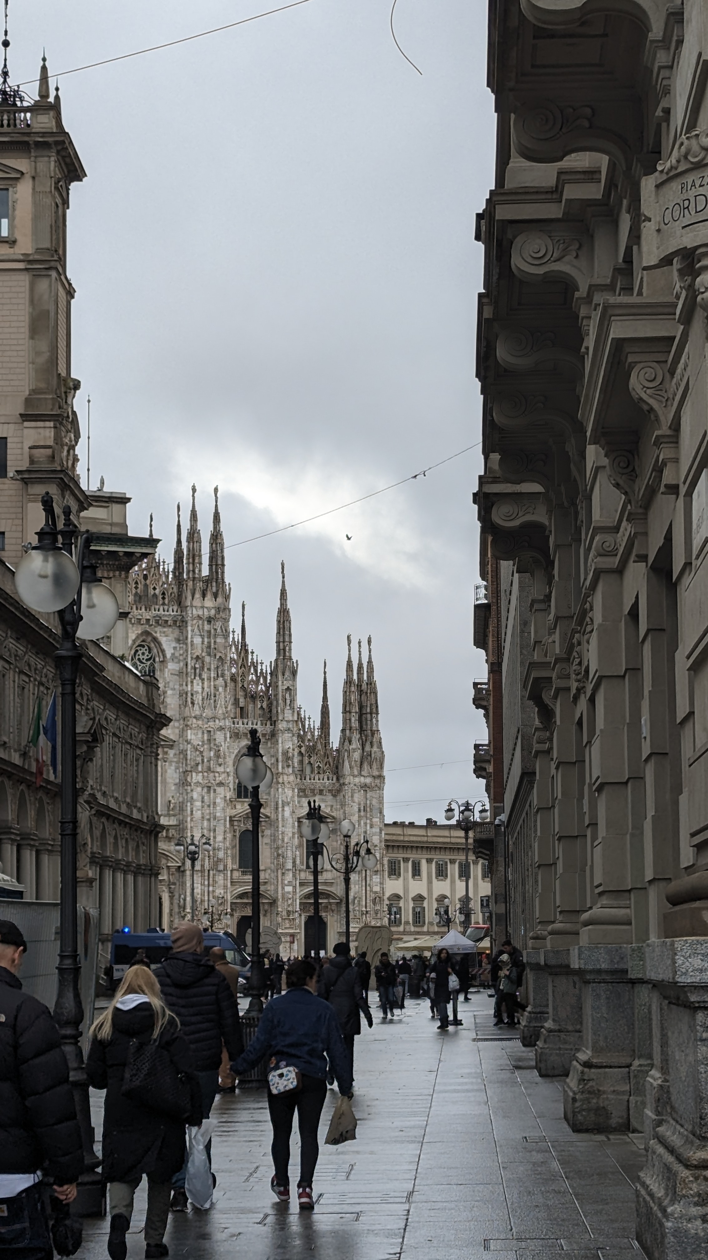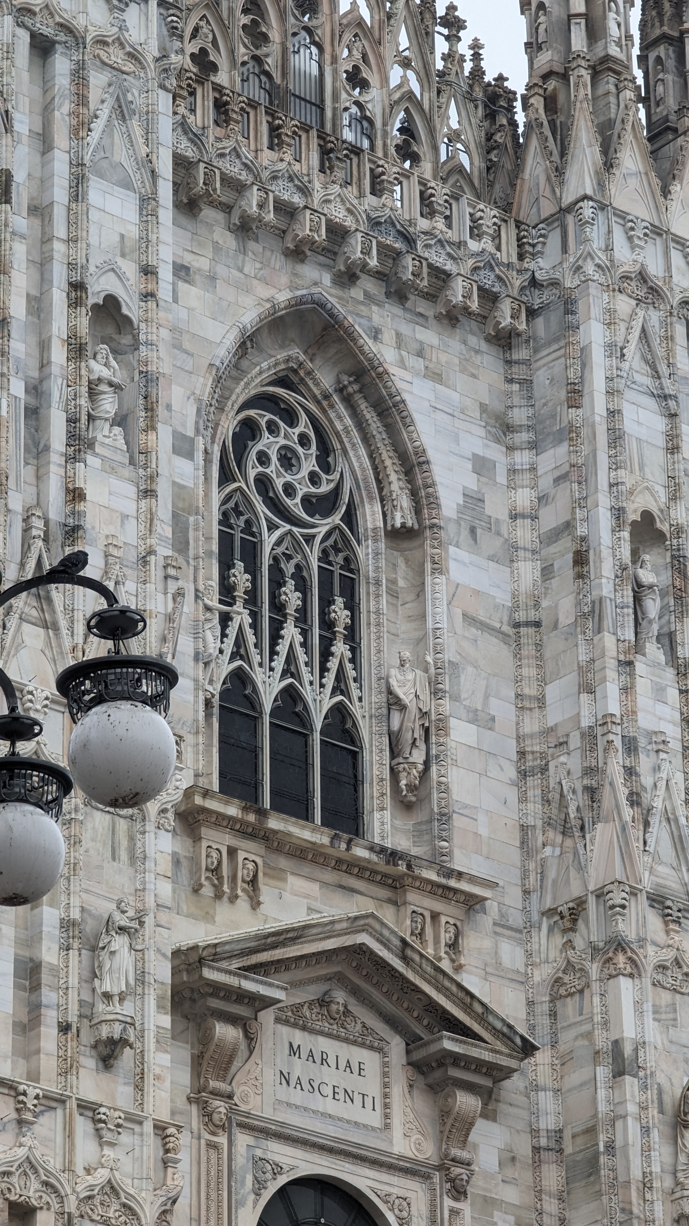 Las más de 3,400 estatuas que adornan el Duomo parecen contar historias de pasión y devoción, mientras que la Madonnina, brillando dorada en lo alto, vigila la ciudad y la protege.