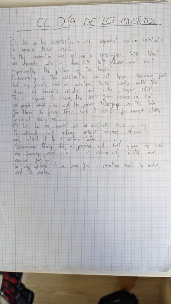 Normally In this celebration you eat typical Mexican food but my family and me sometimes bake cookys with the shape of decorated skulls and also sugar skulls. This is supposed to bring the dead from heaven to eat and people would also put the person’s belongings on the table for them to bring them back to heaven for example: clothes, personal decorations…
