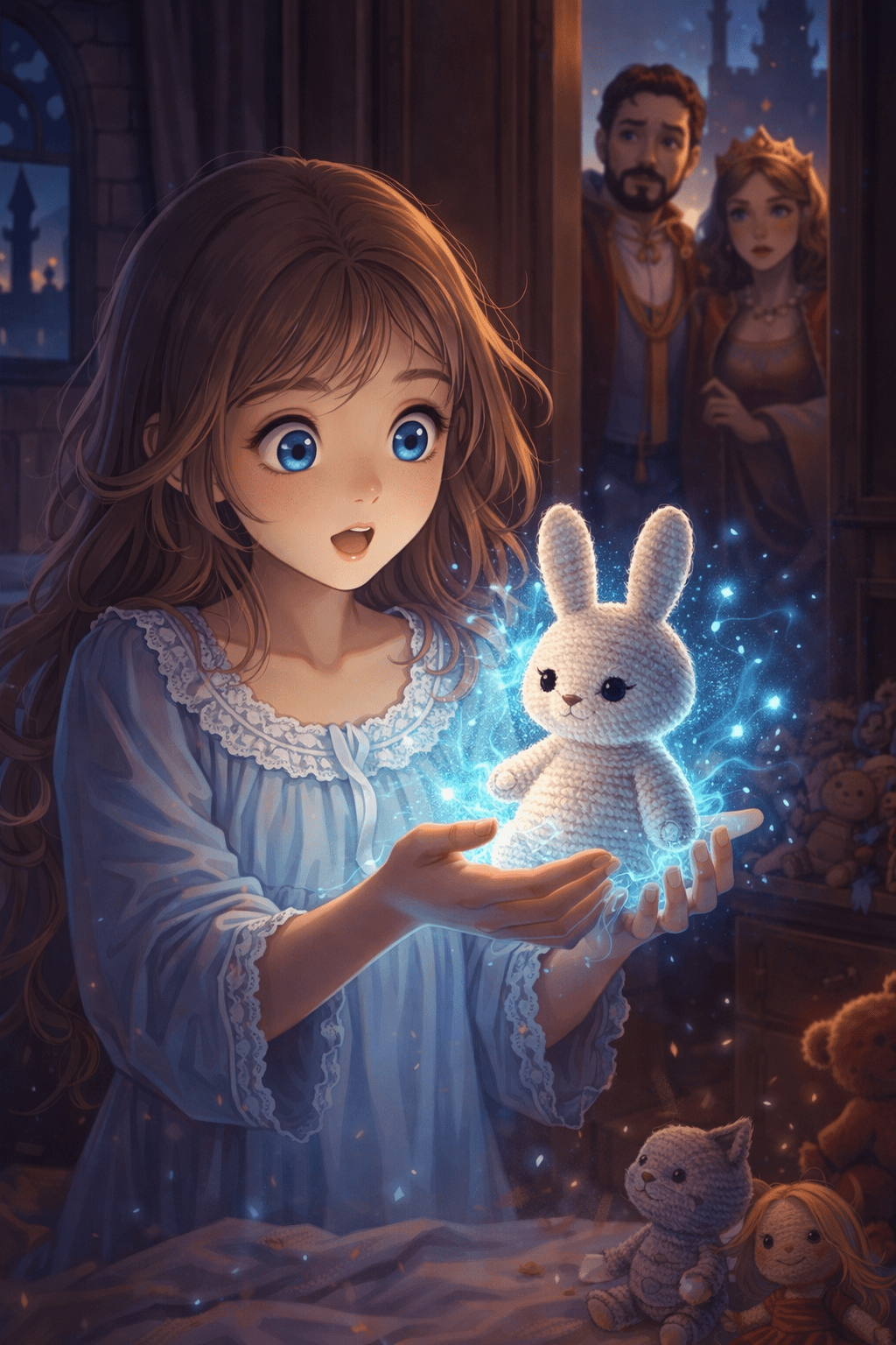 Se despertó a la hora de comer, con los gritos de sus padres llamándola. Ya se había olvidado del muñeco cuando terminó de comer, pero, cuando volvió a su cuarto, se quedó con la boca abierta: el muñeco de lana, un elegante conejo blanco, estaba en el centro de su cama, en la misma cama que había sido ocupada por su dueña hacía solo unos minutos. Además, el conejo tenía una leve aura azul. Alicia, la creadora de aquel extraño peluche, quedó estupefacta; no se lo podía creer. Cogió el muñeco y fue corriendo a enseñárselo a sus padres, los cuales también estaban increíblemente sorprendidos, pero no por la misma razón.